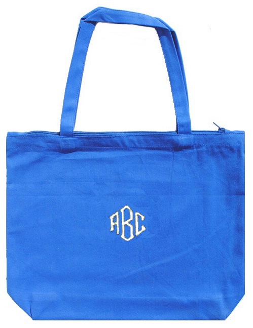 Embroidered 18"x14"x4" canvas or denim zippered tote bags. Monogram is roughly 2"-4" high by 3"-4" wide for 3 characters. Name is roughly .5"-.75" high by 4" wide for 7 characters per line. Allow 3-6 days for embroidering. For an embroidered name, choose any of the M9 fonts available. Name can be capitals, lower case or both. Please note for M1-M8,