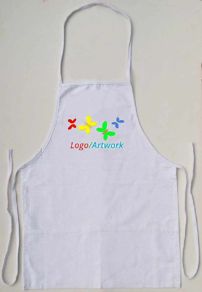Custom printed 18"x24" natural 8 oz white cotton canvas apron with 2 bottom pockets, 10" vertical neck, Maximum imprint area 5"x5". Images should preferably be in JPEG, PDF, TIFF, or BMP format. Send email attachment of artwork here or email us at ingreetings@aol.com. Place order and go through checkout separately. No minimum.