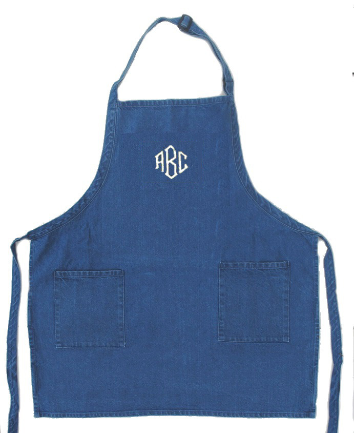 Embroidered 22"x 24", 23"x30" or 27"x33" premium twill or denim apron with Adjustable buckled neck strap and 3 pouches. Monogram is roughly 2"-4" high by 3"-4" wide for 3 characters. Name is roughly .5"-.75" high by 4" wide for 7 characters per line. In white. Allow 3-6 days for embroidering. For an embroidered name, choose any of the M9 fonts available. Name can be capitals, lower case or both. Please note for M1-M8,